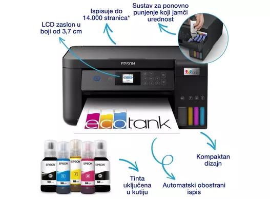 Epson EcoTank L4260 dolazi u modernom i kompaktnom dizajnu, što ga čini jednostavnim za postavljanje u manjim prostorima. Njegovo intuitivno korisničko sučelje omogućuje lako upravljanje svim funkcijama, čineći ga praktičnim rješenjem za svakodnevne potrebe.